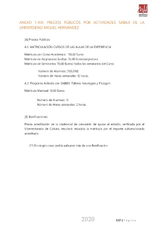 ANEXO T-XIX: PRECIOS PÚBLICOS POR ACTIVIDADES SABIEX DE LA