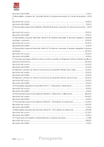 15) Programa de Estimulación multisensorial solo, 2 sesiones mensuales ...................................................... 51.00€.