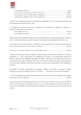c) Por alumno y taller 8 horas (mínimo 15 alumnos) ........................................................................... 50.00 €.