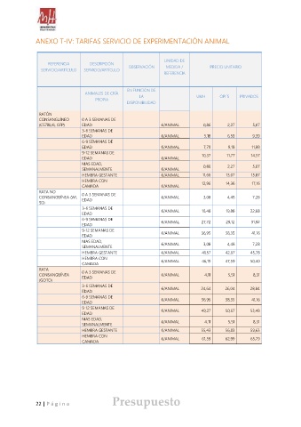 ANEXO T-IV: TARIFAS SERVICIO DE EXPERIMENTACIÓN ANIMAL