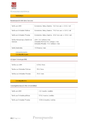 Tarifa uso UMH Contadores Beta y Gamma 6 €/ hora uso o 0.3 € / vial