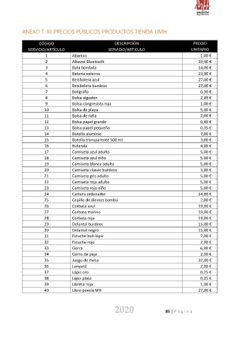 ANEXO T-XI: PRECIOS PÚBLICOS PRODUCTOS TIENDA UMH