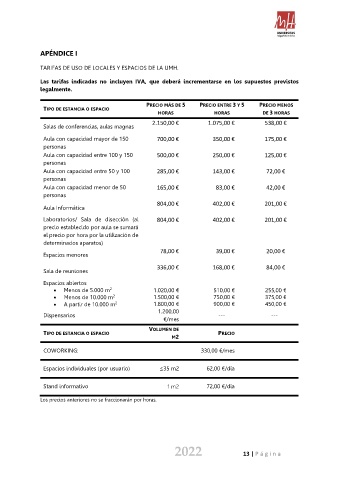 TARIFAS DE USO DE LOCALES Y ESPACIOS DE LA UMH.