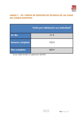ANEXO T – XX: TARIFAS DE SERVICIOS DE ESTANCIA EN LAS CASAS DEL PUEBLO CIENTÍFICO Tarifa por habitación uso individual* Un día 27 € Semana completa 135 € Mes completo 360 € *El uso doble tendrá un suplemento del 20% 2022 75 | P á gi na