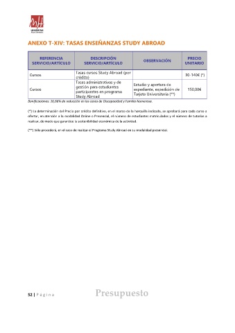ANEXO T-XIV: TASAS ENSEÑANZAS STUDY ABROAD