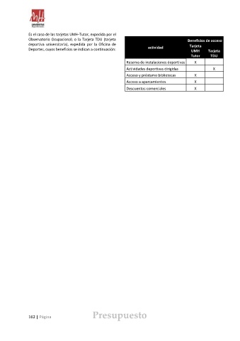 Deportes, cuyos beneficios se indican a continuación: actividad UMH Tarjeta