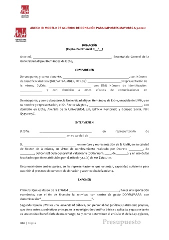 ANEXO III: MODELO DE ACUERDO DE DONACIÓN PARA IMPORTES MAYORES A 3.000 €
