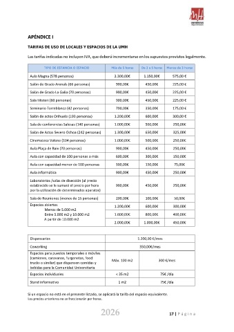 TARIFAS DE USO DE LOCALES Y ESPACIOS DE LA UMH