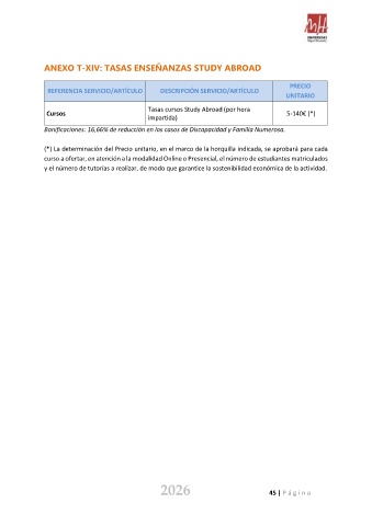 ANEXO T-XIV: TASAS ENSEÑANZAS STUDY ABROAD