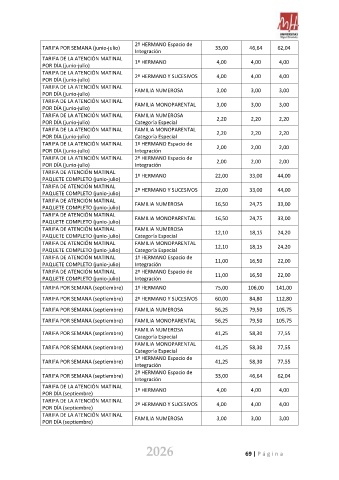 TARIFA POR SEMANA (septiembre) 2º HERMANO Y SUCESIVOS 60,00 84,80 112,80