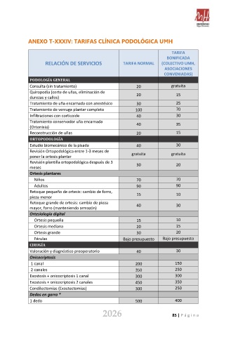 ANEXO T-XXXIV: TARIFAS CLÍNICA PODOLÓGICA UMH